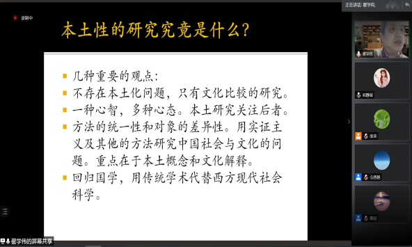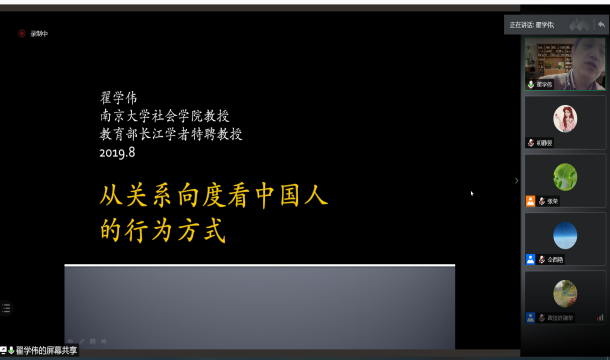 11月3日,我院青龙山论坛(秋冬季论坛)第四期在腾讯会议平台顺利举行。活动邀请南京大学社会学系主任翟学伟教授做题为《从关系向度看中国人的行为特征》的专题讲座。讲座由新2会员管理端官方网站党委书记徐庆国主持,学院师生及相关学者240余人在线参加。