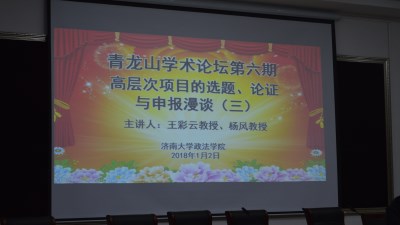 1月2日下午,我院本学年度第六期青龙山学术论坛于四教模拟法庭举行。本次论坛的主题为:高层次项目的选题、论证与申报漫谈(三),邀请主讲嘉宾是王彩云教授和杨风教授。学院党委书记徐庆国、院长梁丽霞、副院长李慧明及全体任课教师出席本次论坛。