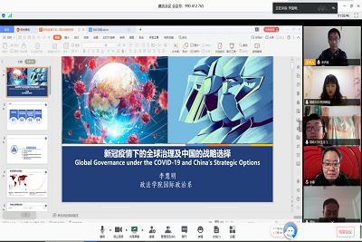 接下来进行专题发言环节。首先,李慧明教授以“新冠疫情下的全球治理及中国的战略选择”为题进行了相关发言,分享了在当前全球疫情蔓延的情况下,对全球治理、国际关系及中国战略选择的看法;然后,云南大学罗肖博士后就“新冠肺炎疫情对南海局势的影响”做了相关分享,为我们看待南海局势提供了一个新角度;最后,周雨琪同学和王龙飞同学分别就“新冠疫情下的全球治理”和“全球疫情下从西方媒体行为看中国抗疫行动的国际影响力”两个主题发表了自己的看法。