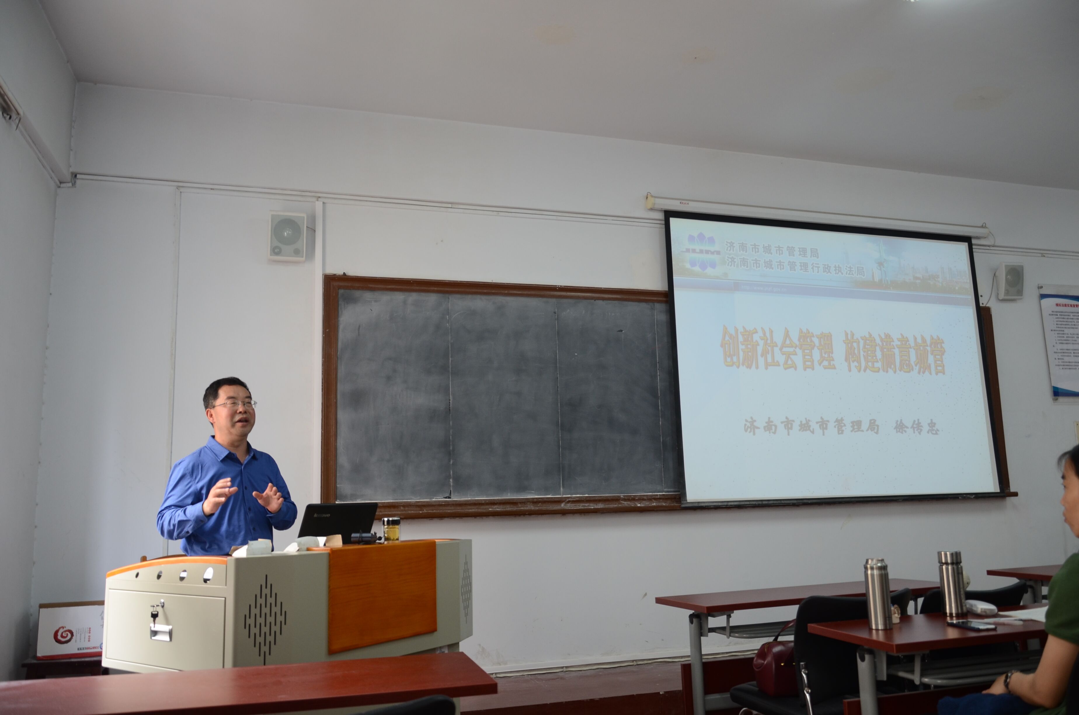 本次报告以网络热议城管负面案例为线索,以济南市城市管理局优秀管理案例为主要经验,以“城管为谁服务”为核心问题,介绍了济南市城市管理局在构建满意城管工作时总结出的指导思想、共同目标和共同愿景。报告处处体现以人民满意为着力点,转变观念、关注民生、创新机制,积极提升城管形象、破解城管难题、提升城管效能,令在场师生对城管执法以及公共管理有了全新的认识。徐传忠巡视员的报告抽丝剥茧、逻辑严密、深入浅出、旁征博引,以实际案例分析为MPA研究生提供了解决公共管理问题的思路和框架,赢得了在场师生的热烈掌声。