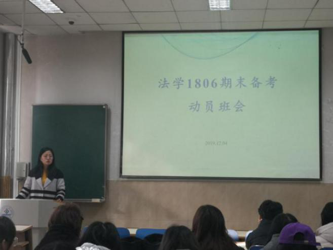 为迎接2018级专业分流后的第一次期末考试,营造积极向上的班级学习氛围,法学1806班于12月4日在1号教学楼召开2019-2020学年第一学期期末考试动员班会。本次班会由班主任刘晓娟老师主持,同学们全员到场准时开始。