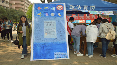 活动开始之前,工作人员早早地摆好了象征水源的蓝色展板和其他活动用品,热情招呼路过的同学们加入活动。不少同学们好奇地涌过来,听青协的同学讲解目前地球环境恶化的严峻性,纷纷表示我们应该从自身做起,从小事做起保护地球母亲。工作人员还为同学们提供了多张需要涂色的世界地图,号召同学们拿起手边的画笔,为地图涂上颜色。同学们依照自己心中的画面,为地球母亲涂上了美丽的色彩,又在旁边的展板保证书上签上自己的名字,表示愿意为保护环境尽自己的一份力量。同时,青协的工作人员也为参与活动的同学们提供了小礼品,鼓励大家为宣传世界地球日做出的贡献。