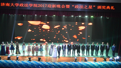 晚会伊始,由到场嘉宾为我院的“政法之星”们进行了嘉奖,之后由sunflower乐队表演歌曲《无地自容》,一首摇滚乐high翻全场,立即带动现场气氛,尖叫声掌声此起彼伏!绘声绘色的师生朗诵积极响应十九届四中全会的号召,济大学子在老师的带领下,点燃学校的新希望。歌舞、小品、朗诵、魔术、乐器联奏等精彩的节目为观众呈现了丰盛的视觉盛宴,让人应接不暇!精彩的三簧《大佬在后面》相声表演使台下观众捧腹大笑,合不拢嘴!晚会最后,俊男靓女们身着正装美裙,秀出风采,秀出魅力,将晚会推向高潮。整场晚会精彩不断,赢得台下阵阵掌声,欢呼声一浪高过一浪,酷炫的舞台灯光更是为晚会增添了一道亮丽的风景。结束后,到场嘉宾、演员与全体工作人员合影留念。