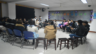 生日会在一片音乐声中拉开帷幕,开场音乐播放的是小虎队的歌曲《爱》,其中歌词“把你的心 我的心串一串 串一株幸运草 串一个同心圆”更是体现了同心圆社会工作协会的主题。杜以芬老师在发言中首先回望了同心圆社会工作协会发展历程,总结了协会工作成果,接着表达了对同心圆社会工作协会成员的教诲与对同心圆社会工作协会未来的期望,最后表达了对同心圆三周年生日的祝福。接下来生日会进入游戏环节。“桃花朵朵开”“解开千手结”“东南西北大风吹”,一个个的小游戏,不仅让参与者通过互动相互认识相互了解,更增强了彼此的默契,为以后社会工作的开展打下了良好得基础;吉他弹唱、相声、空竹表演、歌曲演奏等节目,使现场的气氛变得更加活跃。游戏间隙,大家齐唱《生日快乐》歌,参与者自愿发言,为同心圆社团送上了深深的祝福。最后,同心圆社会工作协会会长张文丽学姐总结发言。至此,同心圆社会工作协会三周年生日会落下帷幕。