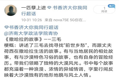 2020年10月30日至11月9日期间,我院阳光先锋青年志愿者协会开展“书香济大”活动,仅短短12天的时间里,我院的同学们踊跃参加,在微博平台上积极发表自己的见解,互相交流,完美营造了良好的读书学习氛围,努力打造书香校园。