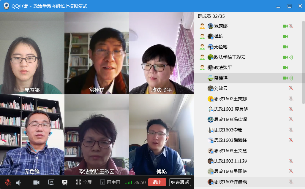 我院历来高度重视学生考研工作,为应对一系列新形势和新变化,政治学系教师精心组织,组建考研群,利用腾讯会议网上平台开展考研线上模拟复试,形成了学院领导、辅导员、学业导师、专业教师齐抓共管、共同努力的良好局面,从动员、备考、初试、复试、调剂等各个环节和阶段为考研学生保驾护航。