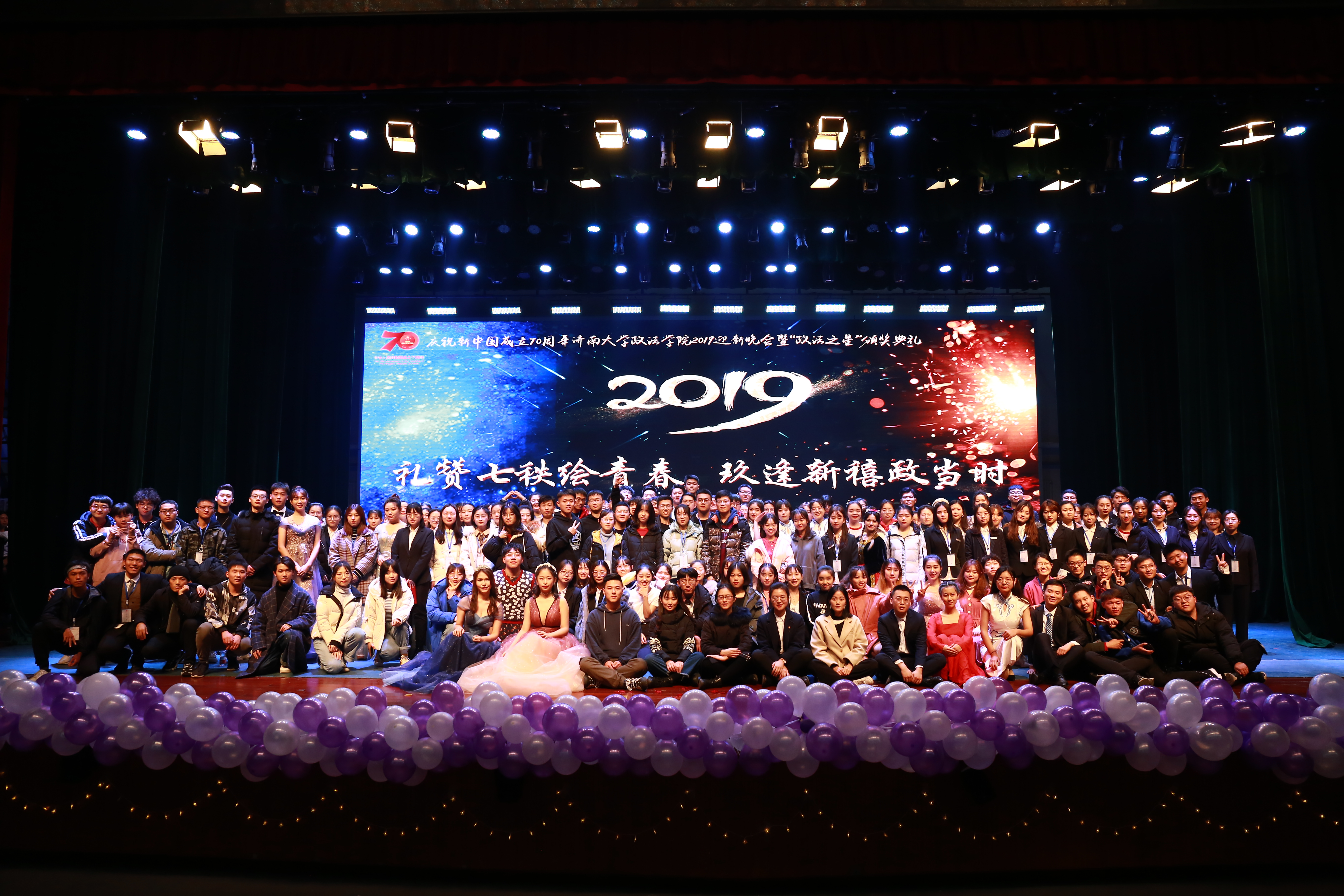 辉煌七十载,筑梦新时代,为庆祝中华人民共和国成立70周年,表彰优秀学子并迎接2019级新生的到来,新2会员管理端官方网站于12月21日晚在济南大学主校区大礼堂成功举办2019迎新晚会暨“政法之星”颁奖典礼。济南大学团委书记孙菲菲、学工处副处长刘芝、社科处副处长孙成豪,新2会员管理端官方网站党委书记徐庆国、院长梁丽霞、正处级组织员国迎春、党委副书记于龙泉、副院长李慧明、副院长高功敬及2001级社会工作专业校友、山东省民族宗教事务委员会办公室副主任江国强,2001级法学专业校友、上海瑾之润申达(济南)律师事务所合伙人皇甫传伟,2005级行政管理专业校友、济南莱济建筑工程有限公司总经理颜炳阁,2011级劳动与社会保障专业校友、中南置地济南区域人力资源经理暴磊磊,2013级政治学与行政学专业校友、济南广播电视台编辑记者崔建超,2015级国际政治专业校友、济南市济阳区仁风镇人民政府党建工作办公室科员李方鹤应邀出席,携1000余名师生观看了本次晚会,现场气氛热烈,掌声不断。