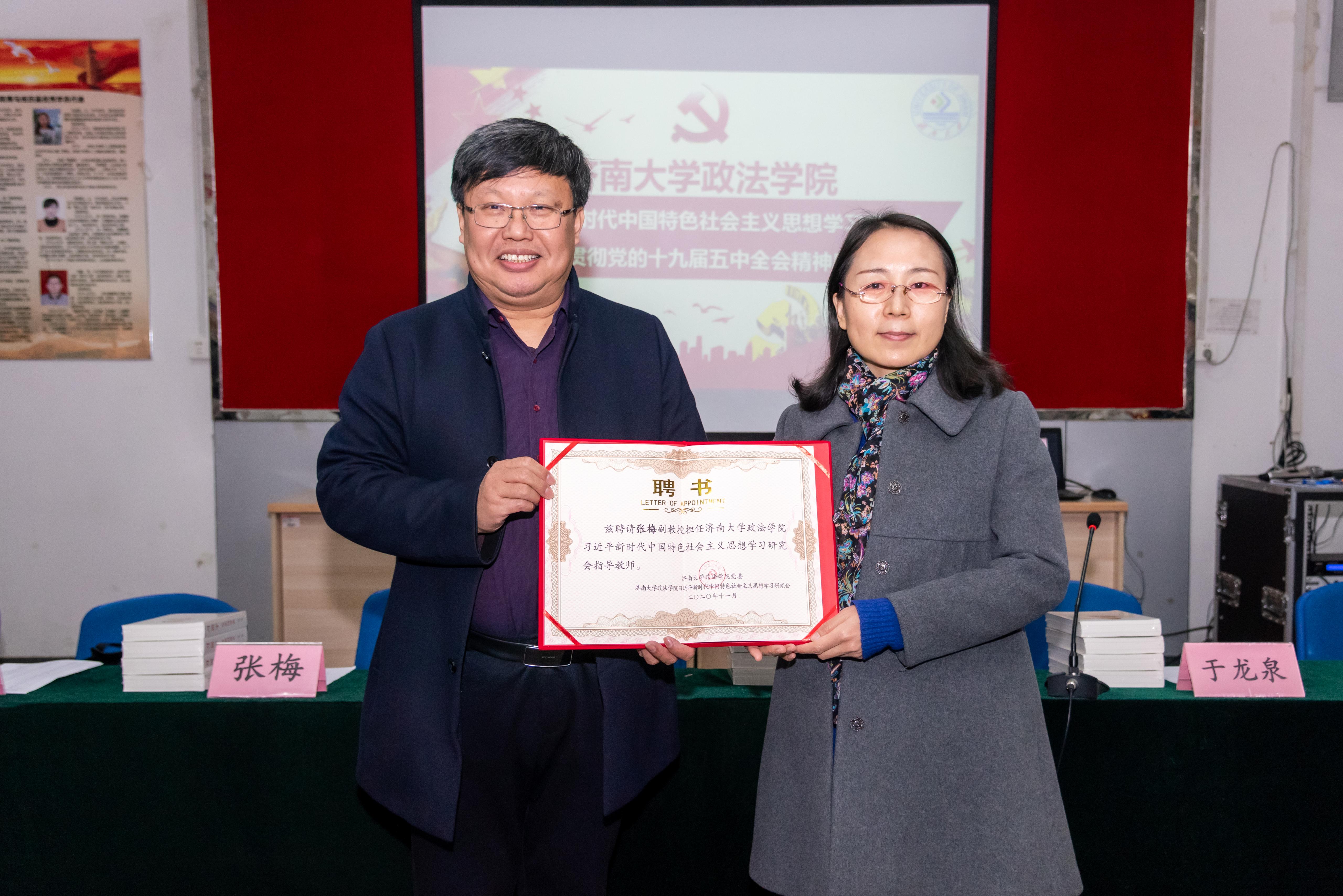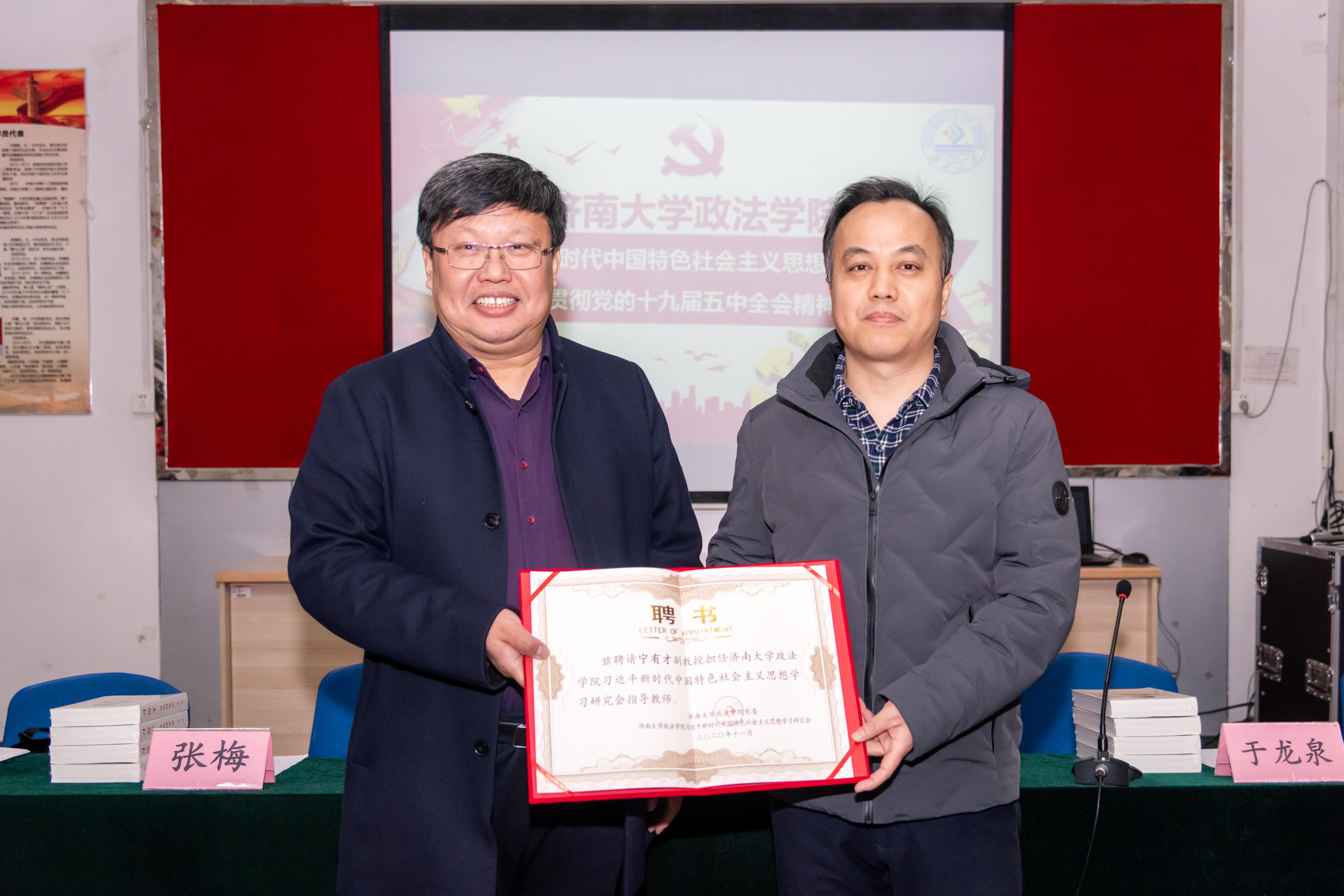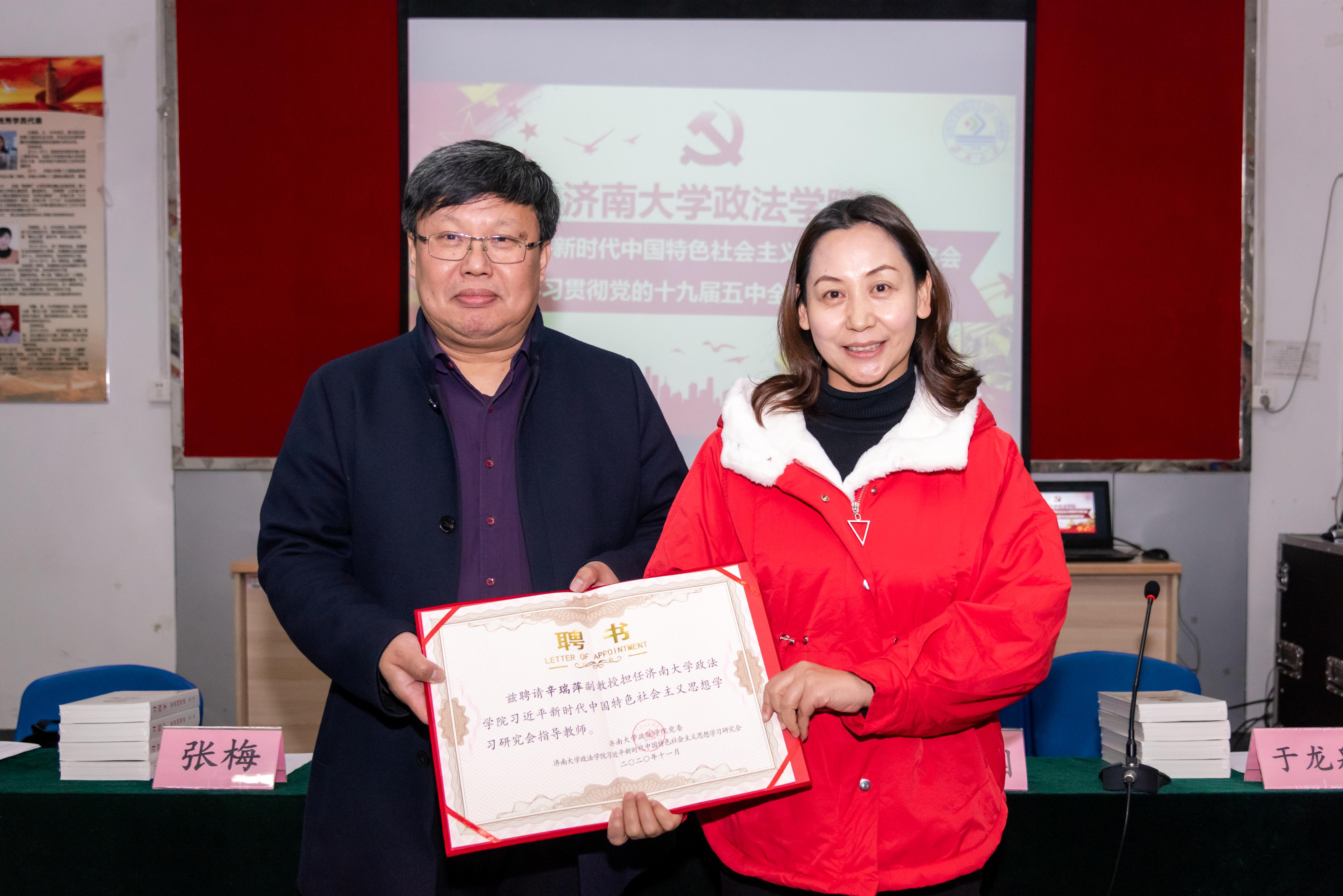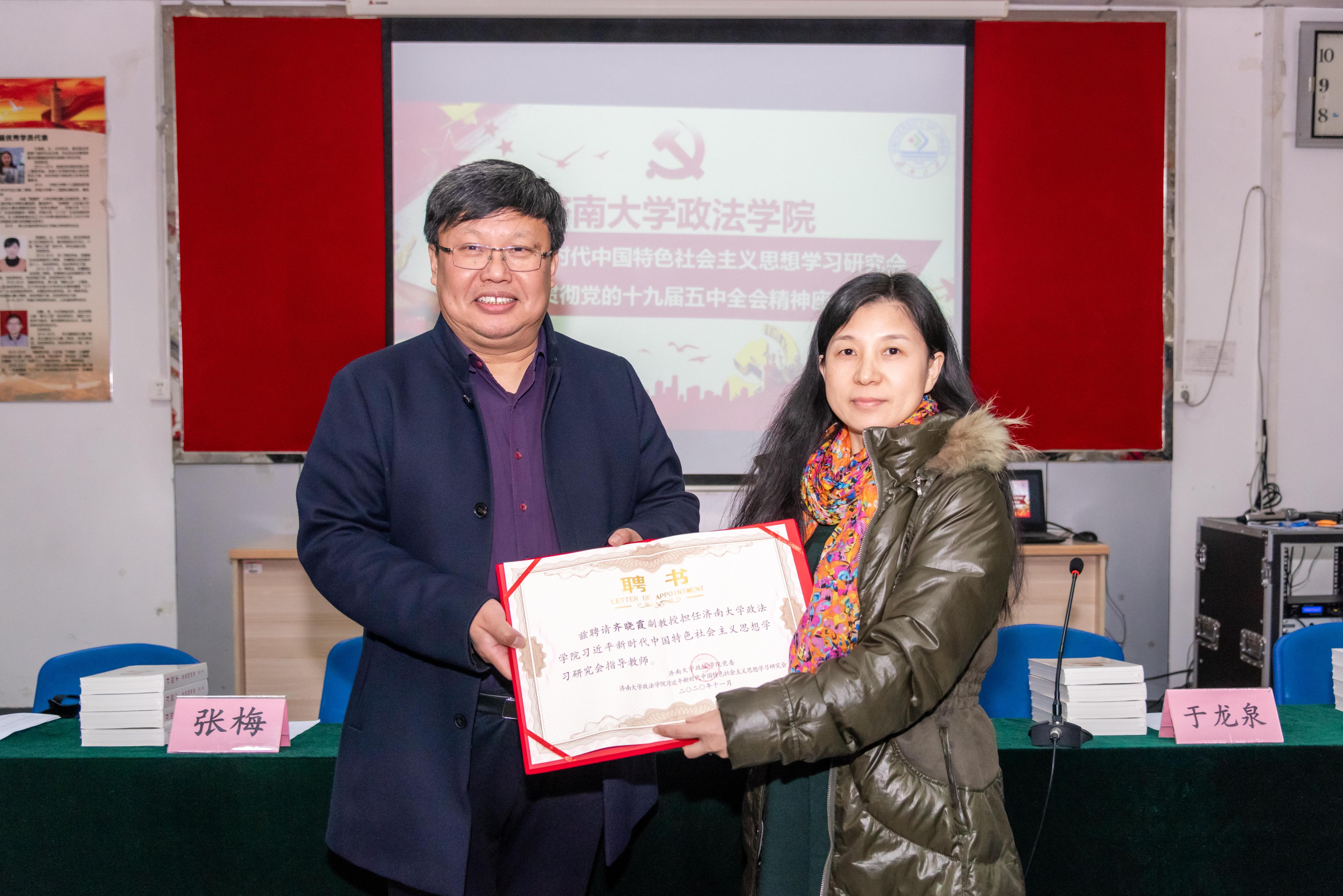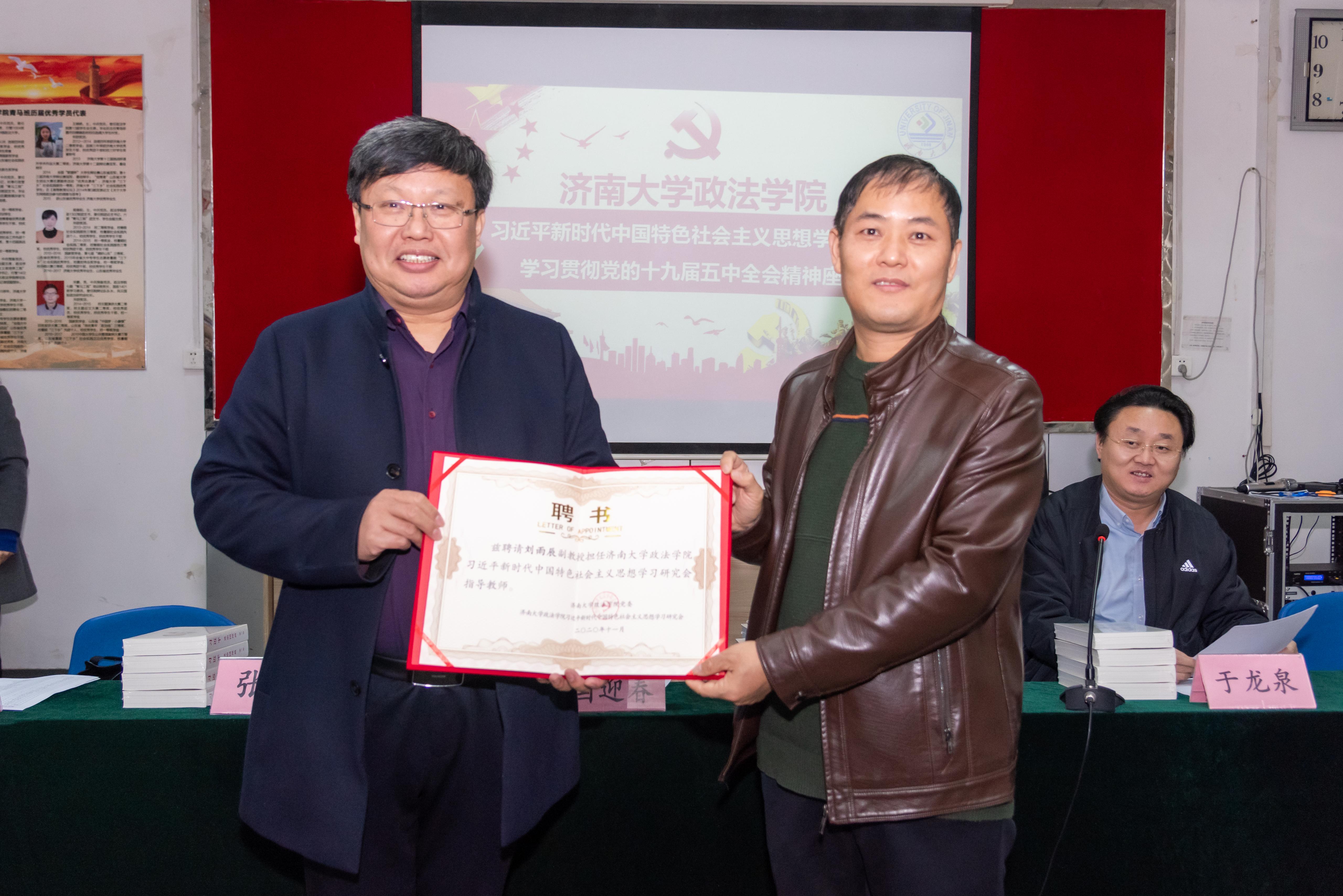 为深入学习、宣传和贯彻习近平新时代中国特色社会主义思想,结合学科专业特色,2017年新2会员管理端官方网站在“青马工程”学生骨干培训班基础上,成立了习近平新时代中国特色社会主义思想学习研究会。在当前认真学习贯彻党的十九届五中全会精神之际,学院从2018级、2019级本科生和研究生中选拔出31名政治素质高、综合能力强的学生干部,组成学习研究会新一届成员。为加强学习研究会建设,学院积极整合力量,发挥专业和师资优势,聘请刘雨辰、张梅、宁有才、齐晓霞、张荣、辛瑞萍6名教师担任学习研究会指导教师。学院正处级组织员国迎春宣读聘请决定,党委书记徐庆国为指导教师颁发聘书,与会嘉宾为每名学员赠送《习近平谈治国理政》第三卷。随后,各指导教师结合自身研究领域,分享学习党的十九届五中全会精神体会,与会师生围绕加强理论学习、促进学风建设、发挥学生干部模范带头作用等方面进行深入座谈交流。