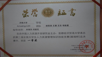 11月3至4日,由中国人力资源开发研究会主办、首都经贸大学承办的第二届全国大学生人力资源管理知识技能竞赛(踏瑞杯)总决赛在首都经贸大学举行,来自全国73所高校的人力资源管理及相关专业的300多名在校大学生参加了比赛,我院师生组成的Amazing-UJN团队荣获一等奖。